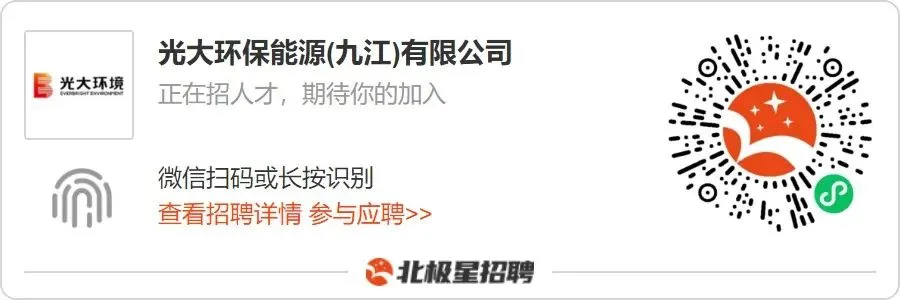 中国光大环境(集团)有限公司(以下称「光大环境」),1993年在香港创立,为光大集团旗下实业投资之旗舰公司,香港联合交易所主板上市。央企中的外企,呈现出更高的效率与活力;外企中的央企,拥有更强的责任与实力。公司经过十多年发展,现已成为中国乃至亚洲环保行业领军企业、世界知名生态环境集团。下辖两家上市企业:新加坡及香港两地双重上市之光大水务(U9E.SG及1857.HK )以及香港上市之光大绿色环保(1257.HK )。公司旗下有环保能源、绿色环保、环保水务、生态资源等业务板块。光大环保能源(九江)有限公司隶属于光大环境环保能源版块,位于江西省九江市柴桑区赤湖工业园,项目于2018年7月8日签约,采用BOOT模式,特许经营期30年(含建设期2年)。项目由光大环境为投资主体,总投资人民币10. 406亿元,建设用地约179亩,总建筑面积5.16万平方米。项目采用炉排炉垃圾焚烧处理工艺,建设3台750吨/天垃圾焚烧炉、2台25MW凝汽式汽轮发电机组及项目配套生活垃圾接受、储存及输送设施,污水处理设施,建设110KV输电线路设施等。我们为员工提供行业内具有竞争力的薪资及年终奖金、岗位晋升空间、六险二金、高温补贴、安全卫生的员工宿舍、食堂、年度免费体检等。绩效奖金带薪年假定期体检尊重人才发展空间大技能培训五险一金管理规范您一定转发给身边需要的人!不要错过报名时间!