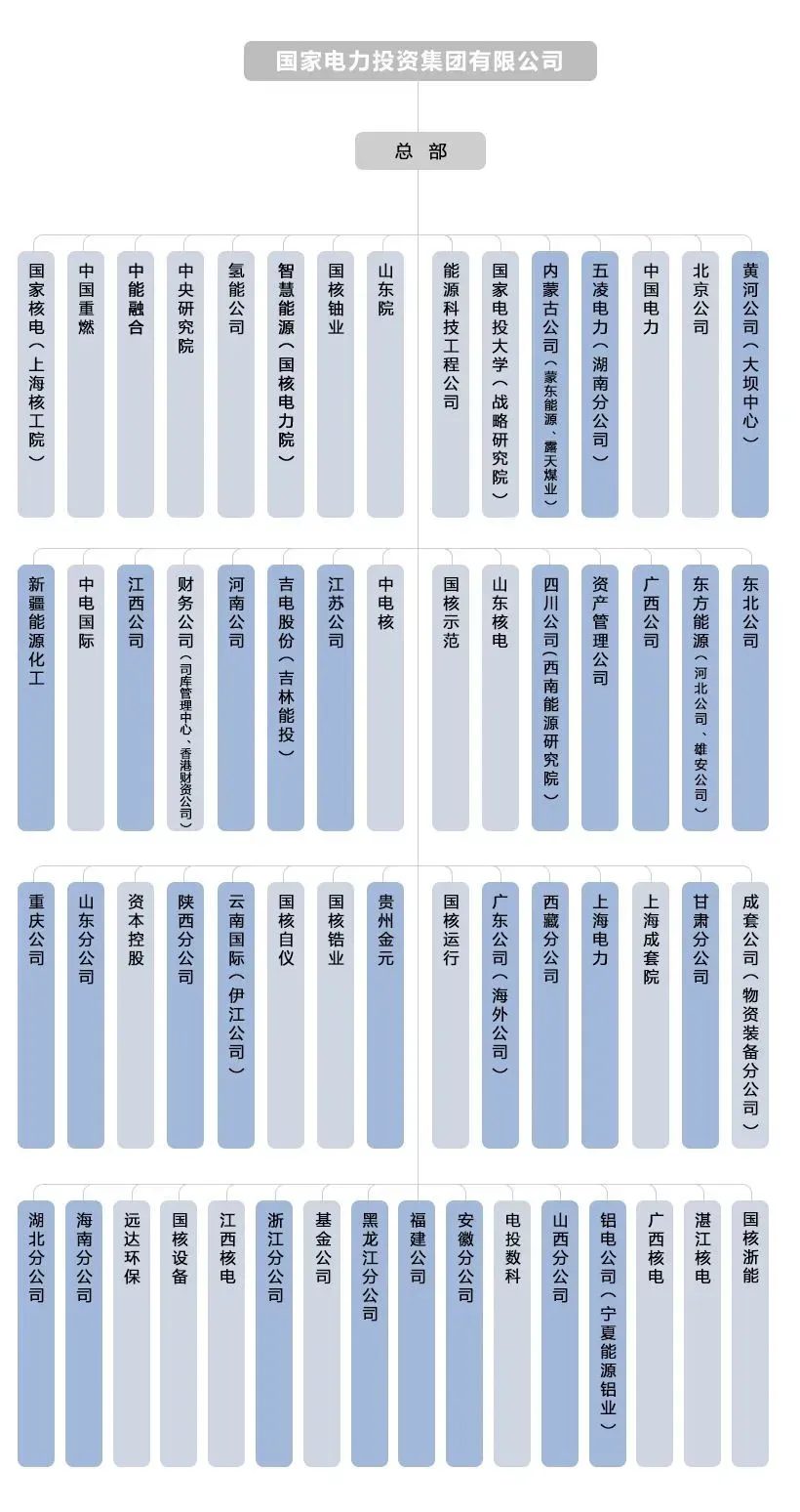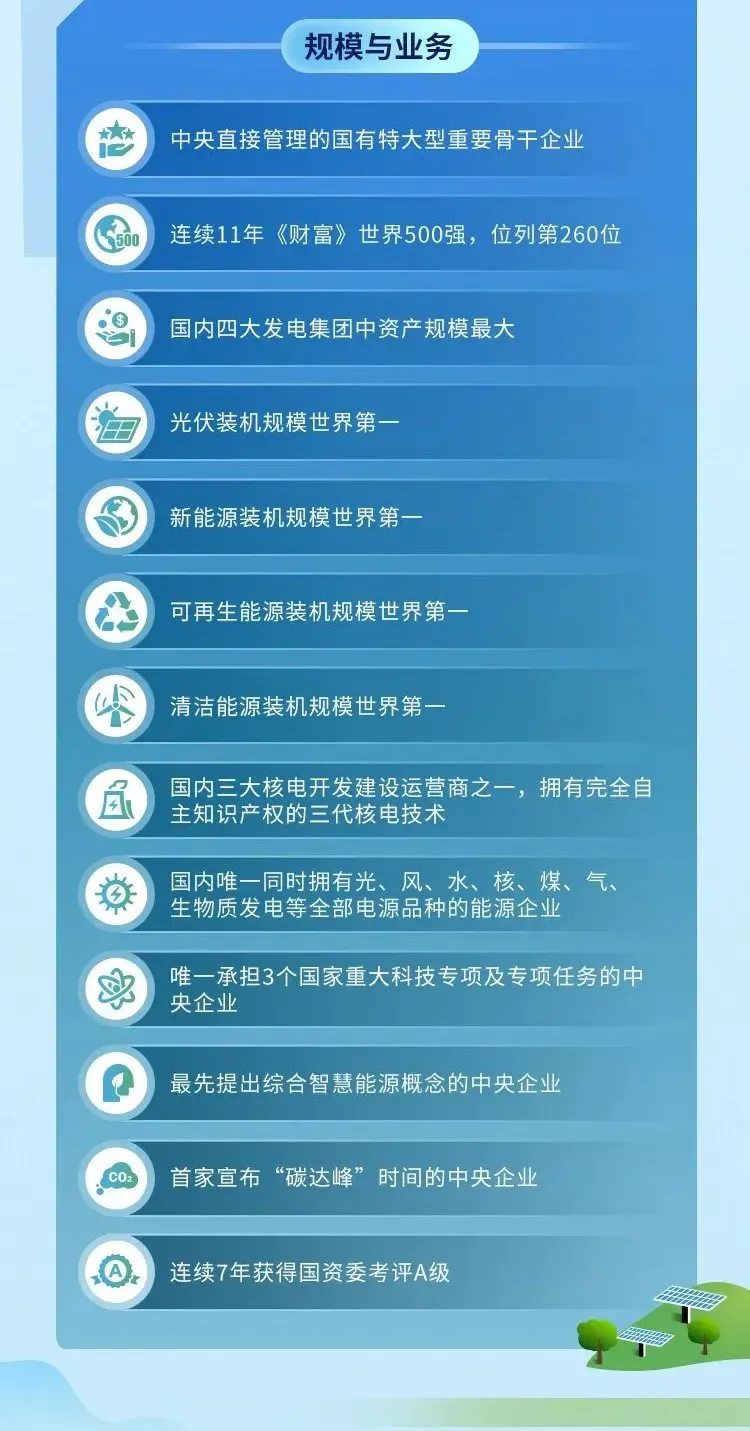 国家电力投资集团有限公司(简称“国家电投”)是中央直接管理的特大型国有重要骨干企业,成立于2015年7月,由原中国电力投资集团公司与国家核电技术有限公司重组组建。国家电投是我国五大发电集团之一,是全球最大的光伏发电企业,2022年在世界500强企业中位列260位,业务范围覆盖46个国家和地区。国家电投现有员工总数13万人,拥有62家二级单位,其中5家A股上市公司、1家香港红筹股公司和2家新三板挂牌交易公司。国家电投肩负保障国家能源安全的重要使命,负责牵头实施“大型先进压水堆核电站”“重型燃气轮机”两个国家科技重大专项,是“能源工业互联网”平台建设任务的主责单位,也是国务院国资委确定的国有资本投资公司试点企业。