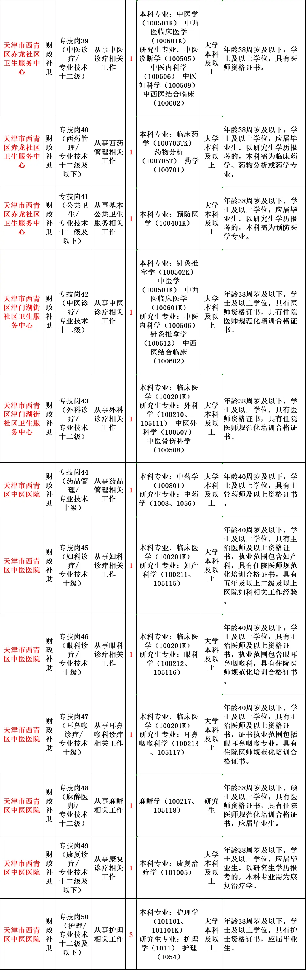 为满足西青区卫生健康系统补充工作人员需求,根据《天津市事业单位公开招聘人员实施办法(试行)》(津人社局发〔2011〕10号)、《市委组织部市人力社保局关于进一步完善事业单位公开招聘工作的通知》(津人社局发〔2017〕37号)及《关于贯彻落实住院医师规范化培训“两个同等对待”政策的通知》(国卫办科教发〔2021〕18号)等有关规定,决定组织实施2026年西青区卫健委所属事业单位公开招聘工作人员工作。现将有关事项公告如下: