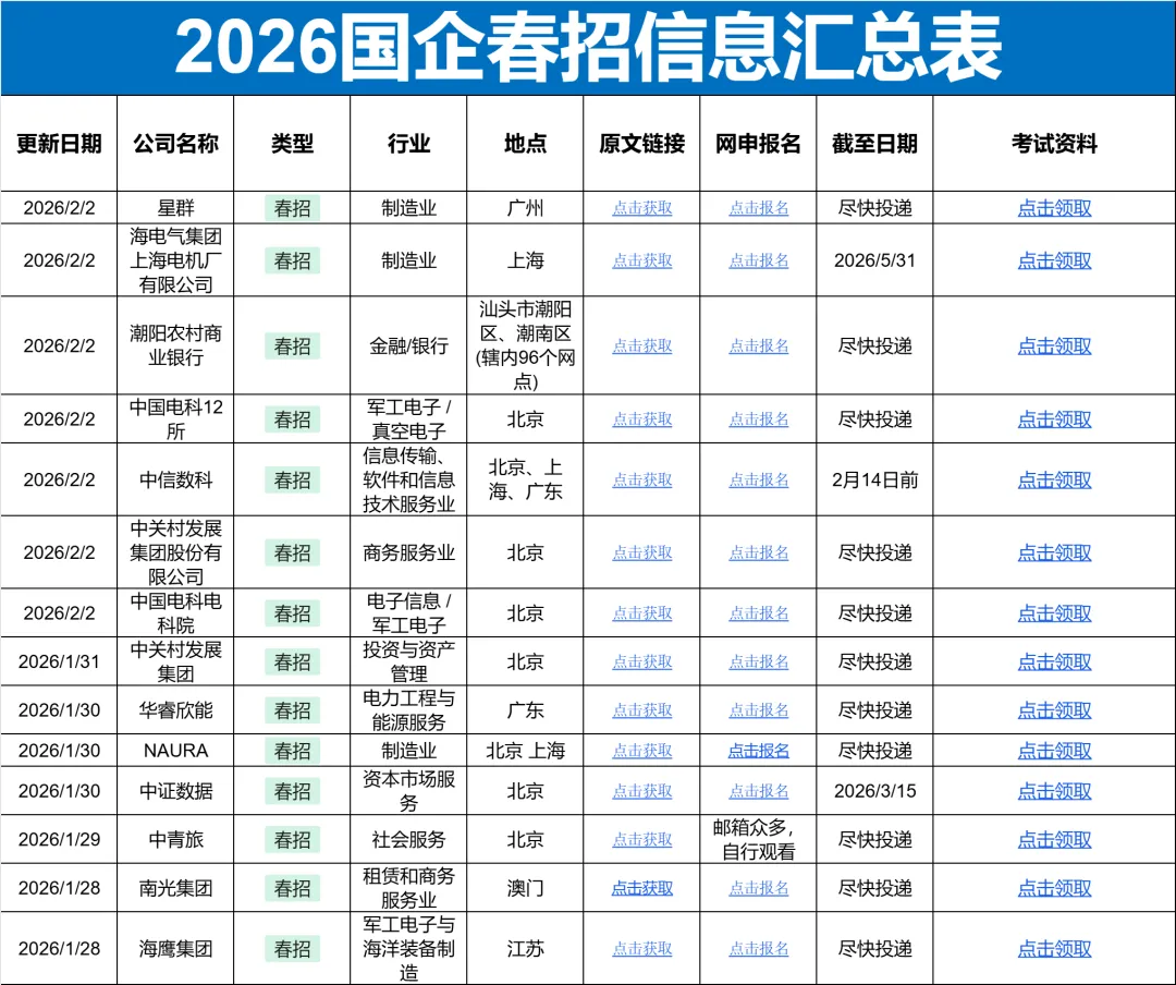 工作稳定≈铁饭碗; 国家背书、实力雄厚,各行业领军企业;地位高、权力大,发展前景稳定; 高薪资,中核集团甚至给应届生开出60W年薪;规模大、管理正规,设施完善; 福利待遇好,足额五险一金、甚至十险两金;免费食宿、免费班车;安家费、落户费、更有大城市落户名额……秋招:央国企求职黄金期 开放岗位多:央国企核心岗位基本都在秋招中放出; 涵盖范围广:技术岗、非技术岗、海外业务岗,文科类、理科类专业全覆盖; 部分未就业可投:秋招主要面向2026届海内外应届毕业生,但很多央国企岗位仍对25届未就业同学开放。✦ 想进央国企的同学,一定要把握好这次秋招的机会➥ 抓紧时间领取《2026届央国企春招网申表》,早投早上岸!