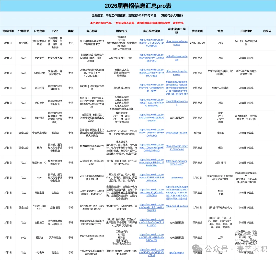 1:我们对接了大量的企业HR/高管/项目负责人/项目组成员/继任招募者,委托我们发布的实习/全职招聘信息都具有非常强的时效性!每日精选10条以上当日实习信息,会员专属!2:我们会定期整理汇总表,分时间:春招/秋招网申汇总表、寒暑假实习信息汇总表、远程实习信息汇总表等...分行业:国企央企汇总表/金融/咨询/互联网/事务所/快消岗位汇总表/国家部委招聘信息等等,每周第一时间分享到VIP会员群!部分展示示如下👇2025-2026年度会员将获得25个+招聘汇总表权益,每个表格将持续更新到周期结束覆盖行业全面:银行/证券/基金/保险/期货/互联网/电子商务/计算机软件/通信/国家机关/高校/研究所/事业单位 /教育/会计师事务所/咨询公司/法律/消费品/零售/服装/家具/贸易/制造业/汽车/电子/电器/机械/石油/钢铁/电力/能源/煤矿/化工/生物/制药/医疗/农林/畜牧/媒体/广告/旅游/公关/文化/影视/酒店.........个性化筛选:所有信息均支持自主筛选,行业-企业-截止时间-投递链接-工作地点…,分门别类,一目了然,既能海投,又能精准投递。每周校招截止提醒⏰:每周截止校招专属提醒,不错过任何一个机会!包括国央企、事业单位、民企、外企、合资企业......。