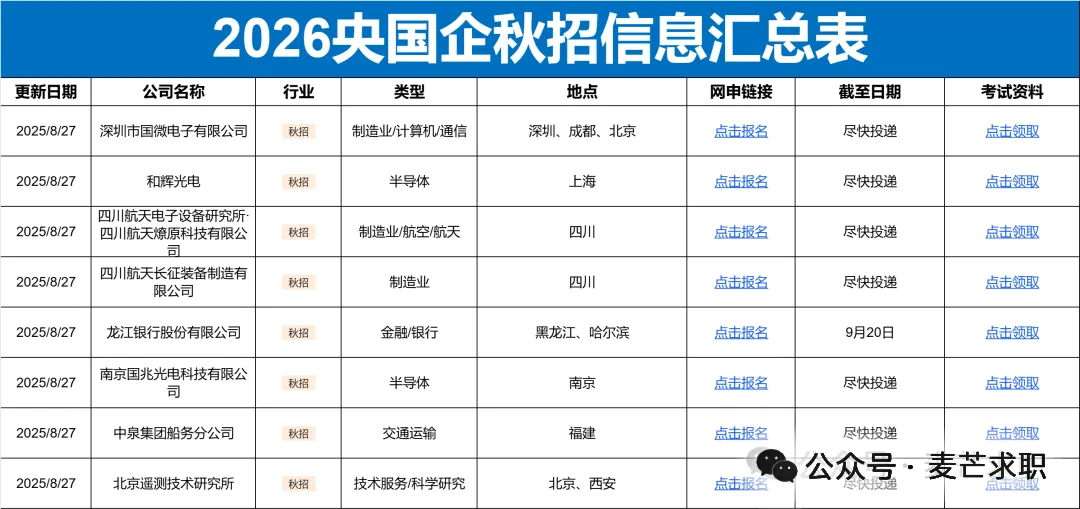 格力电器、中国汽研、中天科技集团、人民网、中央广播电视总台、中国人民银行印钞公司、人民邮电出版社、中国烟草、百度MTS管培生、中国印钞造币集团、白象食品、佳都科技、涂鸦智能、中船智海创新研究院等央国企、事业单位、民企、外企2026届春季校园招聘已经开启!