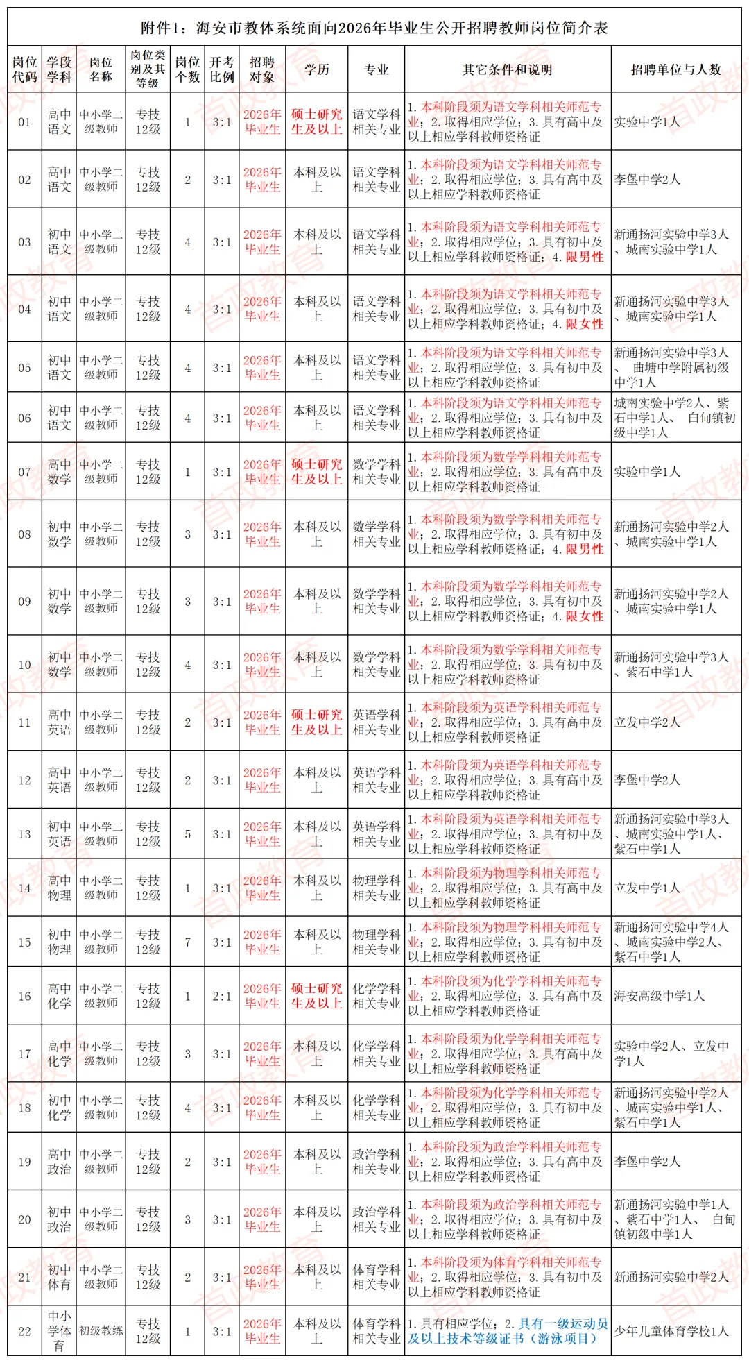 招聘岗位及各岗位招聘条件等详见《海安市教体系统面向2026年毕业生公开招聘教师岗位简介表》(附件1,以下简称《岗位简介表》)。《岗位简介表》可在南通市人力资源和社会保障网、海安市人民政府网、海安教育信息网查询。