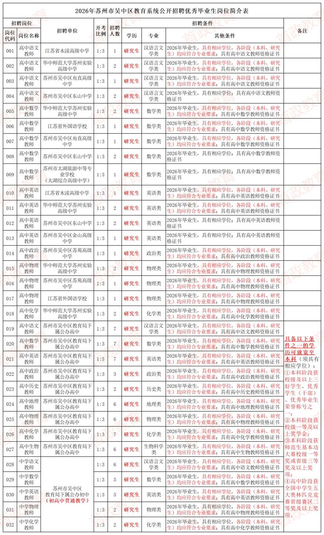 招聘岗位及条件等详见《2026年苏州市吴中区教育系统公开招聘优秀毕业生岗位简介表》(见附件,以下简称《岗位简介表》),可在苏州市人力资源和社会保障局网站(http://hrss.suzhou.gov.cn)、“吴中教育热线”网站(http://www.wxedu.net)上查询。