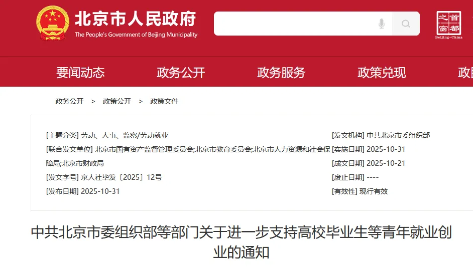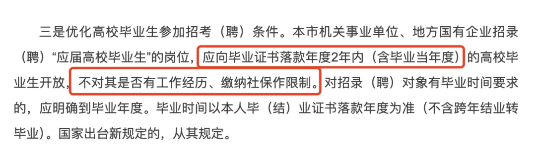 北京市25年10月发布的《关于进一步支持高校毕业生等青年就业创业的通知》中提到,北京市机关事业单位、地方国有企业招录(聘)“应届高校毕业生”的岗位,应向毕业证书落款年度2年内(含毕业当年度)的高校毕业生开放,不对其是否有工作经历、缴纳社保作限制。也就是说: