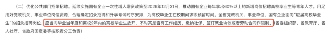 湖北省25年7月发布的《“才聚荆楚·共建支点”促进高校毕业生等青年人才就业创业若干措施》提出,湖北省党政机关、事业单位、国有企业面向“应届高校毕业生”的招录招聘岗位,应当向毕业当年度和离校2年内的高校毕业生放开,不对其是否有工作经历、缴纳社保、签订就业协议或者劳动合同作限制。