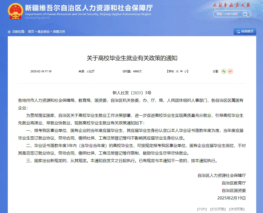 新疆维吾尔自治区25年2月人力资源社会保障厅发布《关于高校毕业生就业有关政策的通知》,明确提出:毕业证书落款年度3年内(含毕业当年度)的高校毕业生,可按规定报考我区事业单位、国有企业应届毕业生岗位,不对其是否签订就业协议、劳动合同、缴纳社保、工商注册登记等作限制,鼓励毕业生尽早尽快就业。