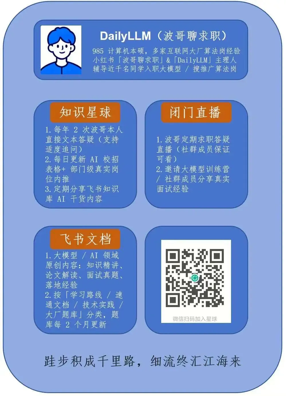 1. 知识星球专属服务:提供每年 2 次波哥本人直接回复的文本答疑(支持适度追问);每日更新独家整理的 AI 校招表格(覆盖秋招、春招、暑期实习),并提供具体到部门 / 团队的 AI 岗位真实内推;定期分享飞书知识库中的 AI 相关知识内容。
