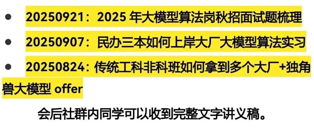 2. 闭门直播服务:针对社群成员开展定期求职答疑直播(提供独家观看渠道及视频 + 文本回放);邀请大模型训练营、DailyLLM 社群成员分享真实面试与求职经验。目前已举办三次闭门会议