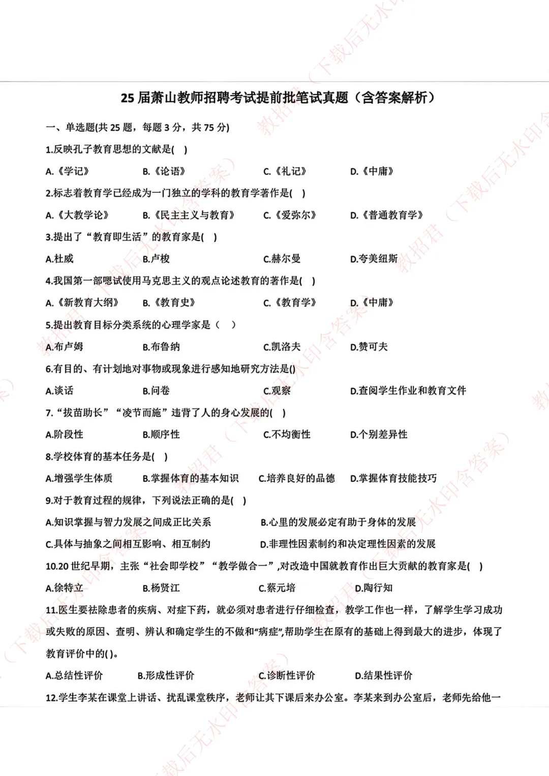 25届萧山教师招聘考试提前批笔试真题(含答案 )