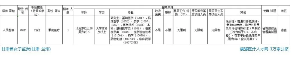 【应届生】甘肃省女子监狱招聘公告,本科起