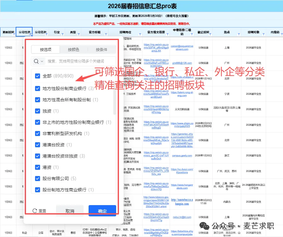 个性化筛选:所有信息均支持自主筛选,行业-企业-截止时间-投递链接-工作地点…,分门别类,一目了然,既能海投,又能精准投递