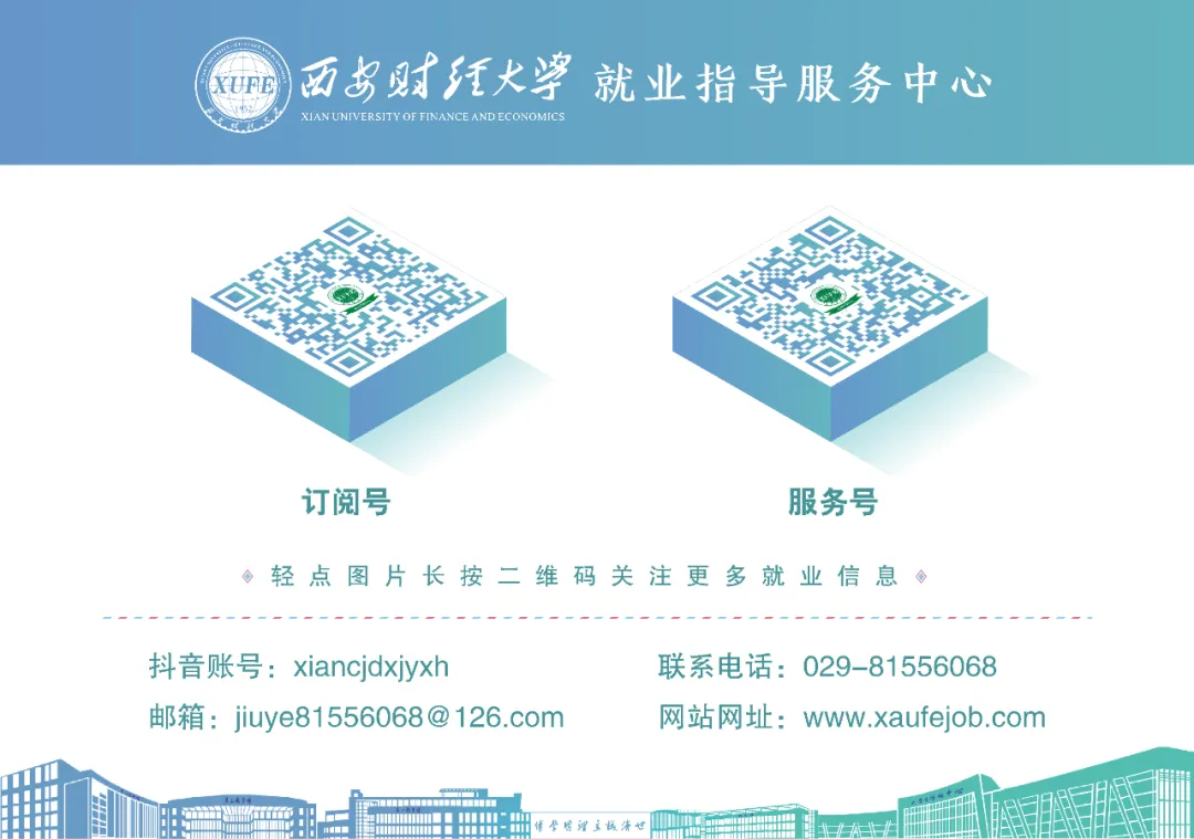 本微信公众号系西安财经大学就业指导服务中心信息发布平台,仅提供信息分享服务,发布所有信息由用人单位提供或网络搜集,如涉及侵权,请联系我们删除。广大毕业生请注意信息的真实性及安全性,如发现问题,请及时向我们举报。