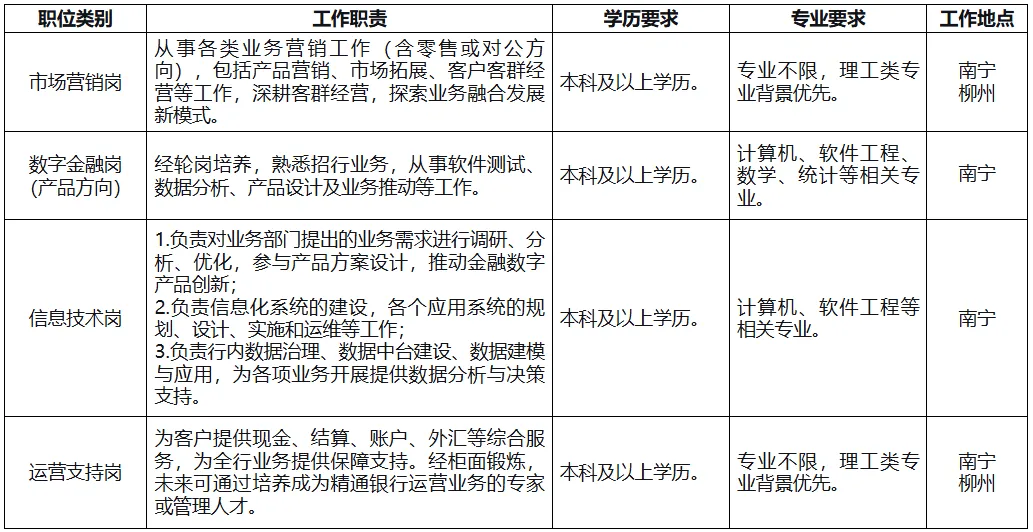 招商银行南宁分行成立近十七年,正处于快速发展阶段。我们坚持以人为本的经营理念,注重人才培养,为广大应届毕业生的发展成长创造良好的就业环境,制定清晰的职业发展规划,提供展现自我、实现价值的宽广舞台。2025年招商银行南宁分行荣获2025年度华南地区“杰出雇主”奖项、2025年金融服务口碑“消保服务典范机构”、2025年度南宁城市“最佳雇主”的称号等,目前已成为八桂大地最具品牌影响力的商业银行之一。价值领航,向新出发,百年招银,你我共建!