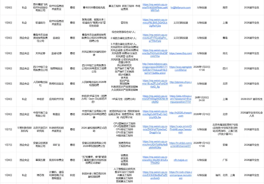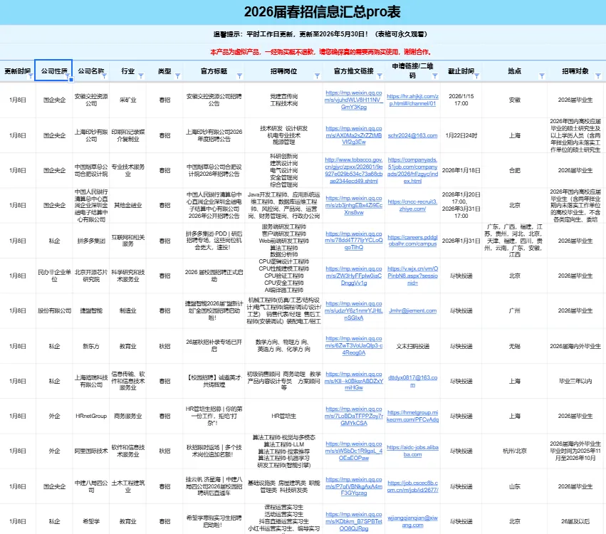 包括国央企、事业单位、私企、外企、合资企业,全行业类型!涵盖互联网/金融/科技/制造业/咨询/快消/医药/地产/教育/文娱等行业❗本汇总表为在线文档,订阅需申请权限,不支持表格下载/编辑/复制,介意勿订!❗本汇总表供学生校招网申投递使用,家长如若购买,请让学生申请权限,除非家长自己使用!