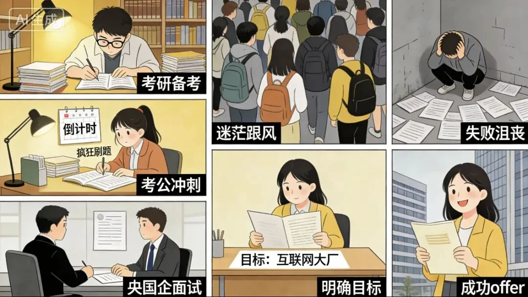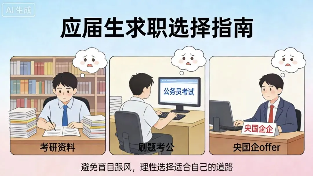 最近我发现身边很多大学生兄弟姐妹们都在为”毕业去向”焦虑得睡不着觉。考研?考公?还是冲央国企?看着周围同学都在卷,自己也不由得陷入了”选择恐惧症”。