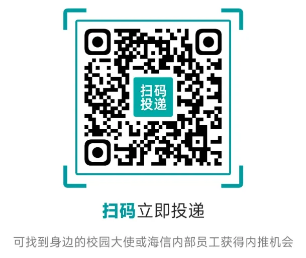 关注“海信集团招聘”公众号-菜单栏点击“校园招聘"或扫描下方二维码投递
