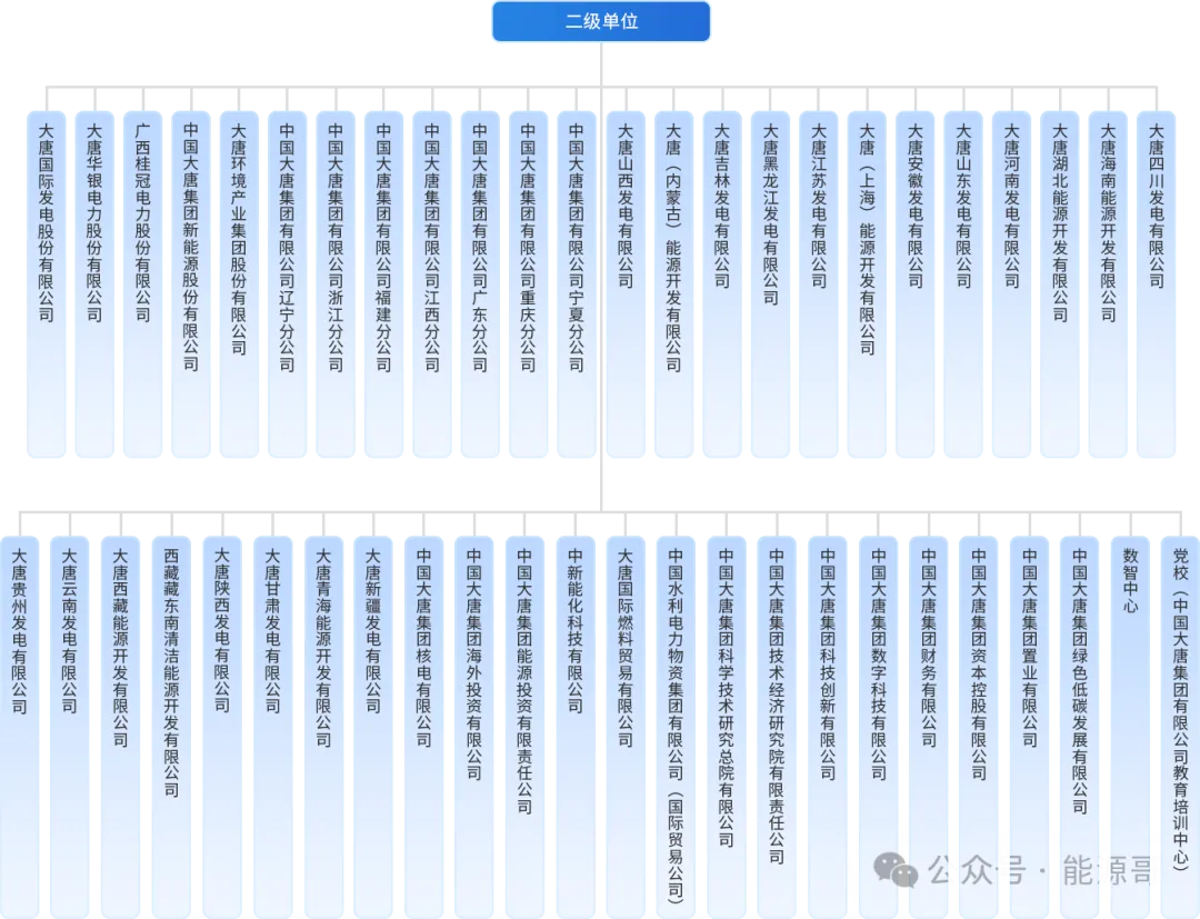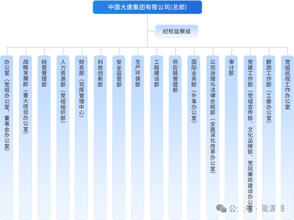 中国大唐集团总部设纪检监察组,下设办公室、战略发展部等二十余个职能部门,覆盖经营、人力、安全、党建等全业务管理;二级单位包含多家发电股份公司、各区域分公司,以及核电、科技、物资、金融等专业子公司,还有党校、数智中心等支撑机构,形成总部职能管控+区域/专业二级单位运营的架构,业务布局多元且管理层级清晰。