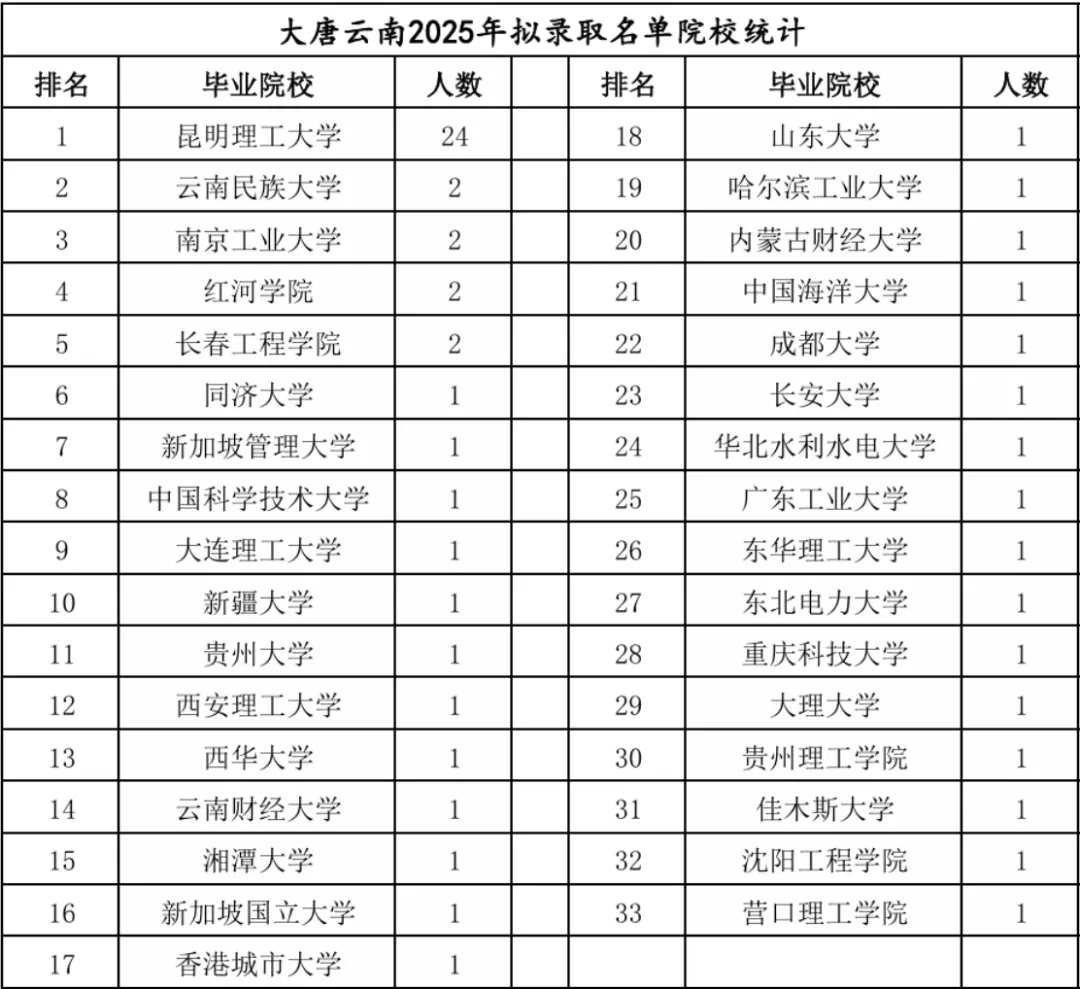 2025年大唐集团云南拟录用人员共60人,昆明理工大学作为云南工科就业的地头蛇,被录用人数远多于其他院校。而其他众多院校只有1或2人被录用,包括很多985、211院校,当然,这就和大家的职业规划有关了。