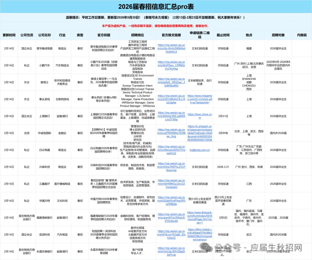 2:我们会定期整理汇总表,分时间:春招/秋招网申汇总表、寒暑假实习信息汇总表、远程实习信息汇总表等...分行业:国企央企汇总表/金融/咨询/互联网/事务所/快消岗位汇总表/国家部委招聘信息等等,每周第一时间分享到VIP会员群!部分展示示如下👇