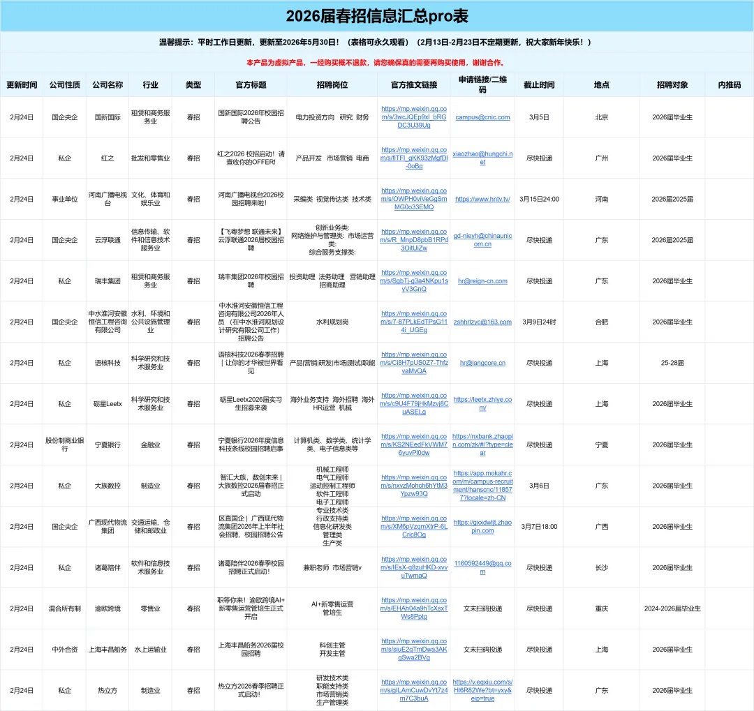 2:我们会定期整理汇总表,分时间:春招/秋招网申汇总表、寒暑假实习信息汇总表、远程实习信息汇总表等...分行业:国企央企汇总表/金融/咨询/互联网/事务所/快消岗位汇总表/国家部委招聘信息等等,每周第一时间分享到VIP会员群!部分展示示如下👇