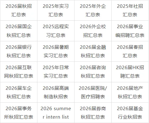 2:我们会定期整理汇总表,分时间:春招/秋招网申汇总表、寒暑假实习信息汇总表、远程实习信息汇总表等...分行业:国企央企汇总表/金融/咨询/互联网/事务所/快消岗位汇总表/国家部委招聘信息等等,每周第一时间分享到VIP会员群!部分展示示如下👇