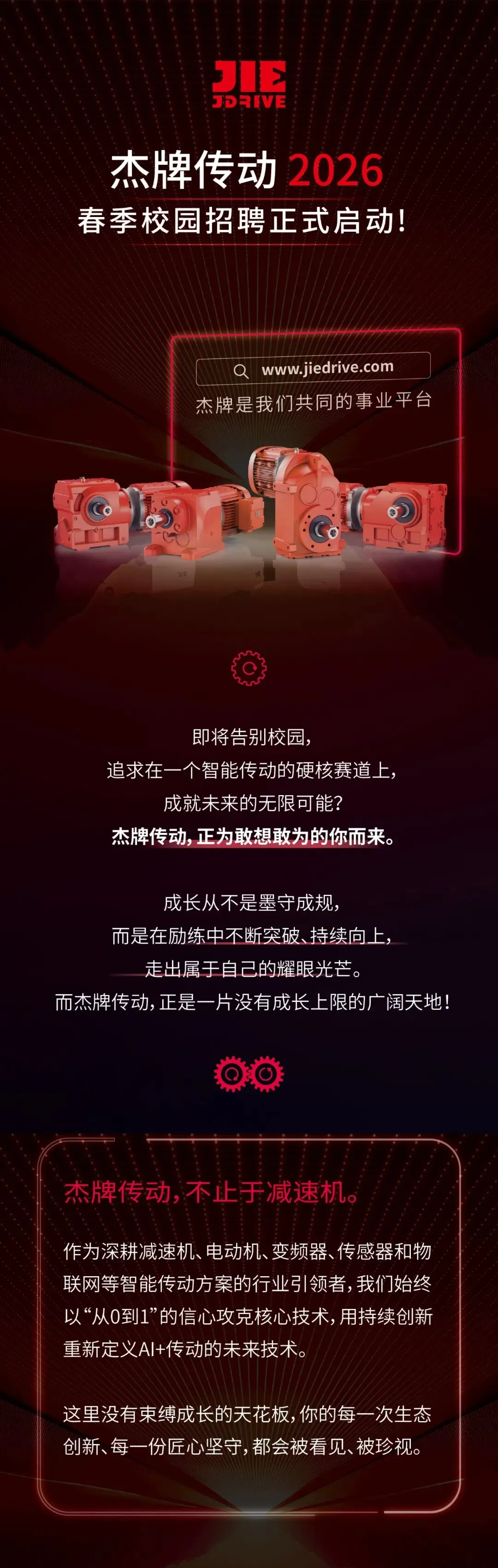 Established in 1988, JIE has been insisting on manufacturing a great intelligent reducer in 100 years, aiming to build a Chinese world brand with its craftsmanship. JIE Drive, as the wholly-owned subsidiary of JIE Holdings, with a wholly-owned subsidiary JIE USA, has been awarded as the “Hidden Champions” in China,“Lighthouse Factory” in Zhejiang,Green Low-carbon Factory in Zhejiang,Research Institute of Key Enterprises in Zhejiang,Industrial Internet Platform in Zhejiang. JIE, is a national High-tech Enterprise, with innovation platforms such as JIE Intelligent Transmission Research Institute, National Postdoctoral Research Workstation, National Recognized Reducer Laboratories, Peking University & JIE Joint Laboratory of Intelligent Transmission, China Machinery Industry Reducer Engineering Technology Center and Enterprise Technology Center. JIE focuses on five core technologies: the Transmission Technology, Drive Technology, Control Technology, Software Technology and Future Technology. It also implements digital intelligent technologies incl. Execution Layer, Acquisition Layer, Drive Layer, Control Layer & Data Layer, in addition to the intelligent drive solutions incl. gearboxes, motors, inverters, sensors & Internet of Things. JIE, based on the Chinese market, servers the great customers with great products worldwide.With the core strategy of “Specialization, Intelligence and Globalization”, JIE is dedicated to the Innovate the development model of “Research Institute + Innovation Center + Intelligent Factory”, to build a century-old JIE and achieve more happy families.JIE, a provider of Intelligent Drive Solutions!转载:官方公告,侵删!