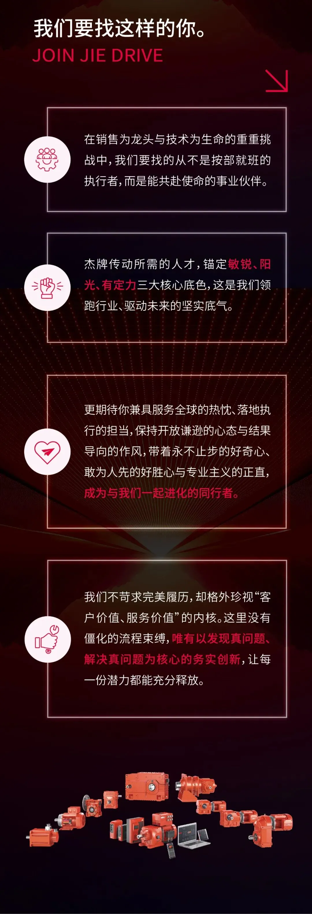 杰牌是国家高新技术企业,建有杰牌智能传动研究院、国家博士后科研工作站、国家认可减速机实验室、北大杰牌智能传动联合实验室、中国机械工业减速机工程技术研究中心和企业技术中心等创新平台。杰牌聚焦传动技术、驱动技术、控制技术、软件技术和未来技术等五大核心技术,执行层、采集层、驱动层、控制层和数据层等数字智能技术,减速机、电动机、变频器、传感器和物联网等智能传动方案,立足中国市场、服务全球市场,杰牌为全球好客户做好产品。