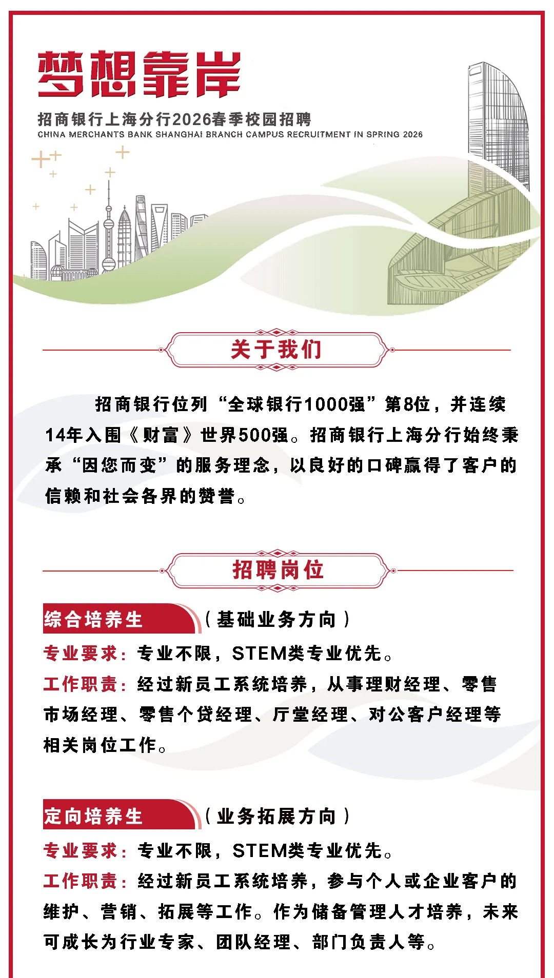 >招商银行上海分行2026春季校园招聘启动,多专业可投!