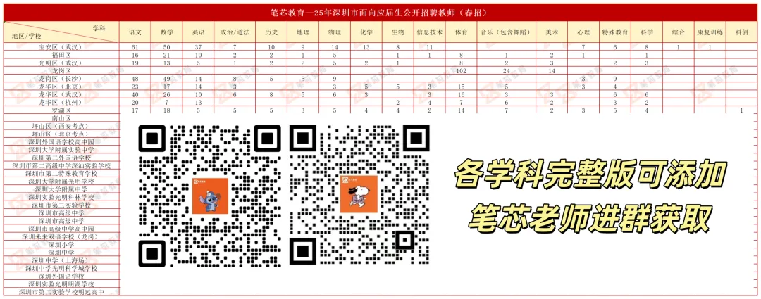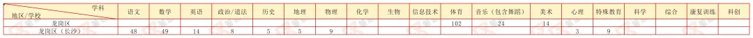 龙岗区25年春招绝对是音体美学科的福地,单深圳考点,体育学科就招聘了102名,而且音乐、美术招聘也不少,分别是24名、14名,可以说是音体美的专场了。另外一场是长沙设立考点,主要是以主科为主,语数英招聘最多。
