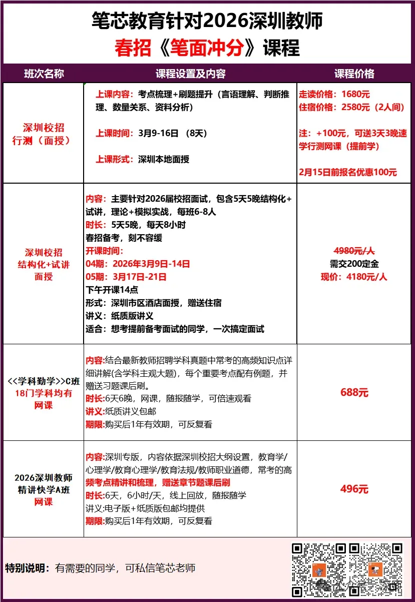 2、教综精学A班(网课):时长(6天)随报随学,根据深圳校招考试大纲研发,针对性强,春季寒假期间可以提前学习,提供电子版建议及纸质版讲义。