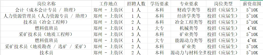 ✅ **招聘对象**:应届毕业生(纯校招,仅面向应届生开放)✅ **工作地点**:郑州市上街区(所有岗位地址统一)✅ **学历要求**:大专/本科(岗位学历要求明确,专业对口即可)✅ **薪资范围**:4~10K(大专4~6K,本科5~10K,按劳定薪,多劳多得)✅ **专业要求**:经管类(财政学、经济学)、工科类(冶金工程、矿业、机械、能源动力等)✅ **岗位性质**:国企正式校招岗,签订正规劳动合同豫才宝典求职提醒