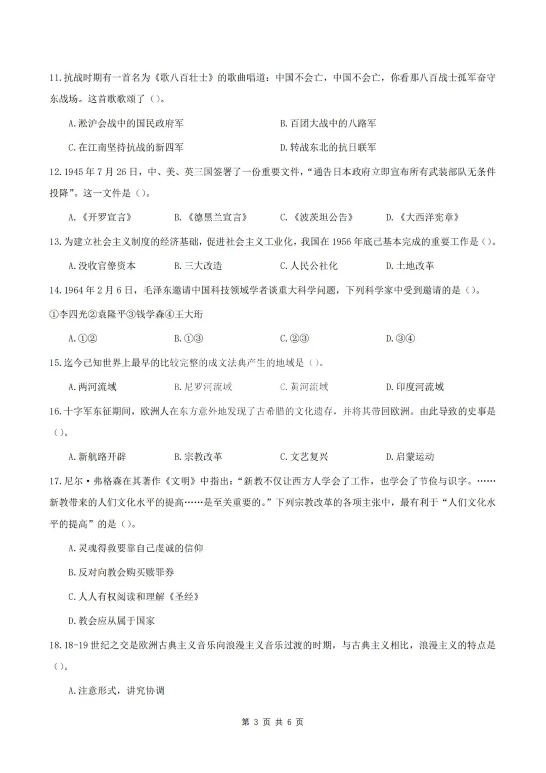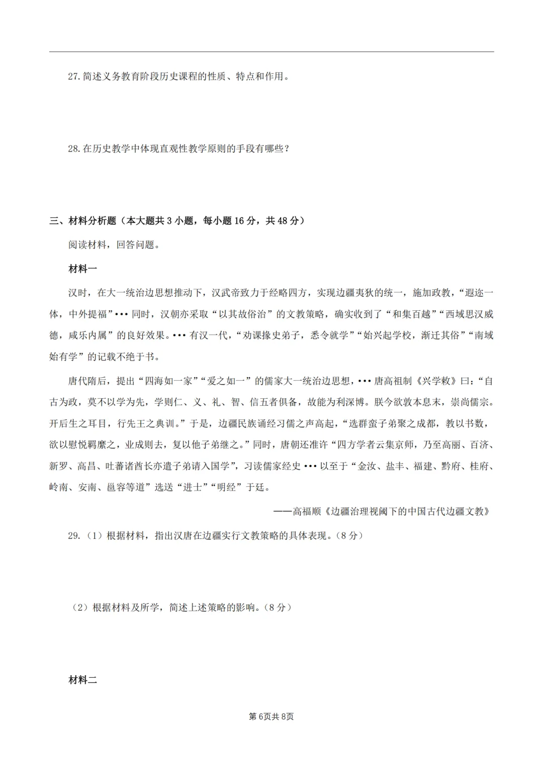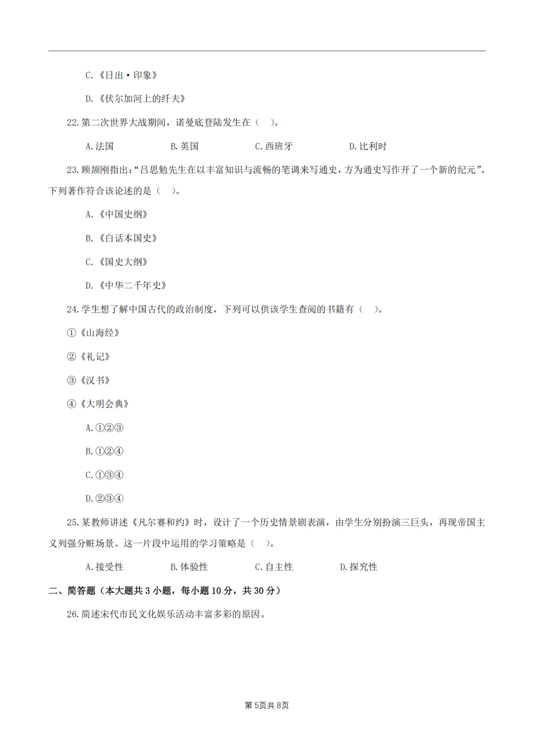 26年3月教资笔试科目三初中历史历年真题汇总含答案可打印
