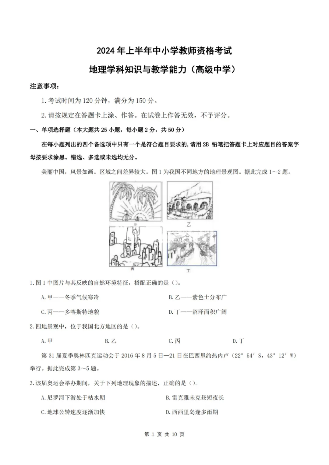 >26年3月教资笔试科目三高中地理历年真题汇总含答案可打印