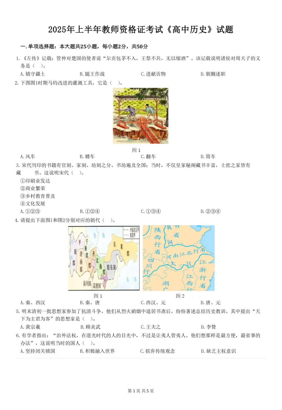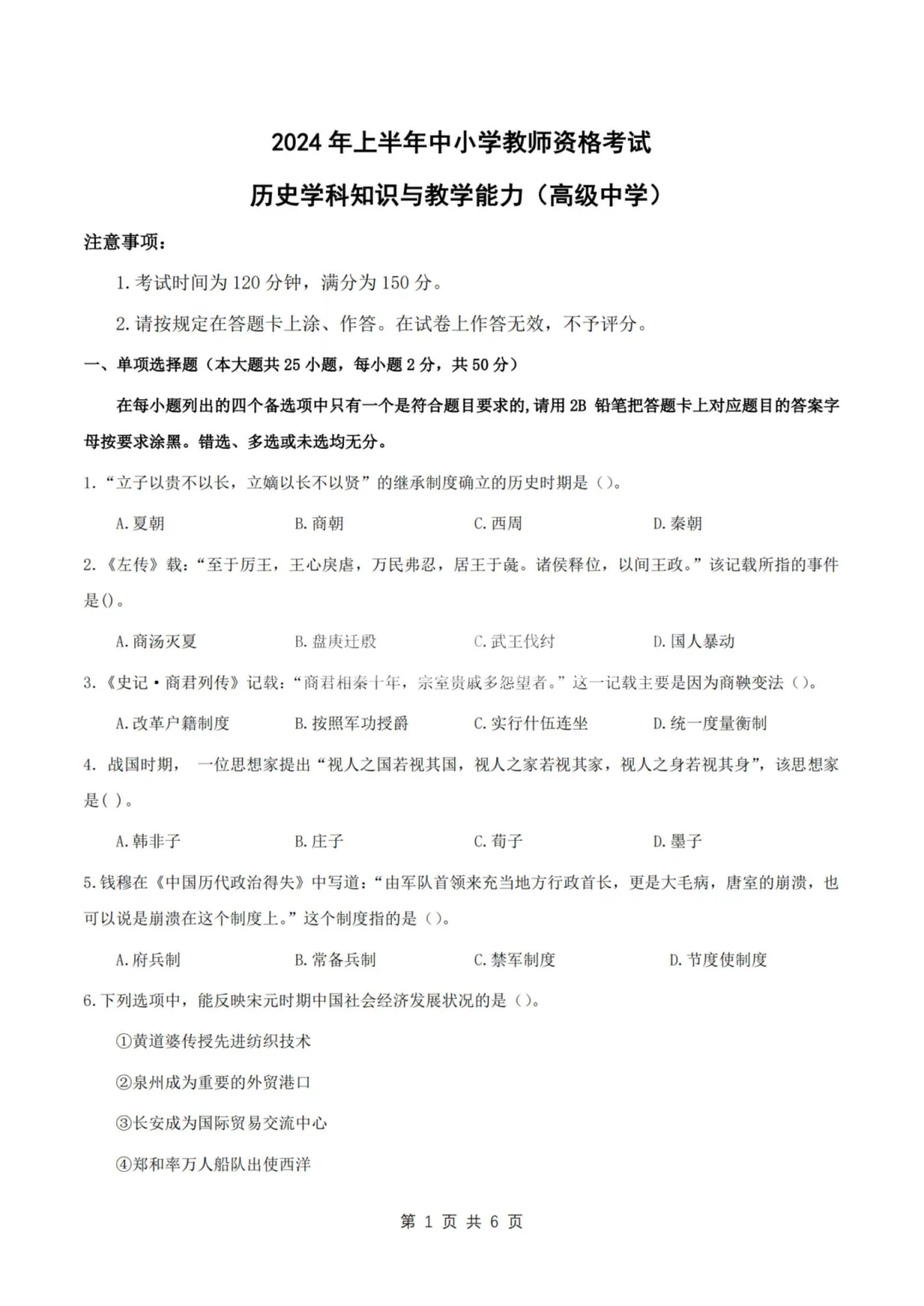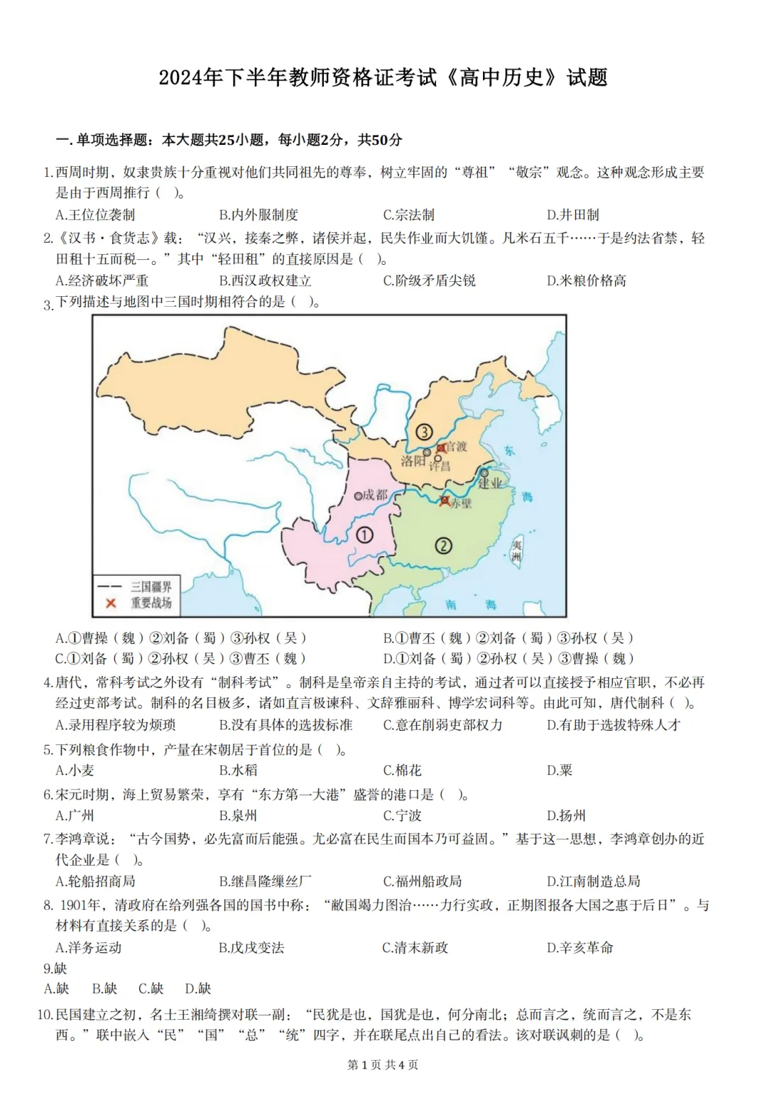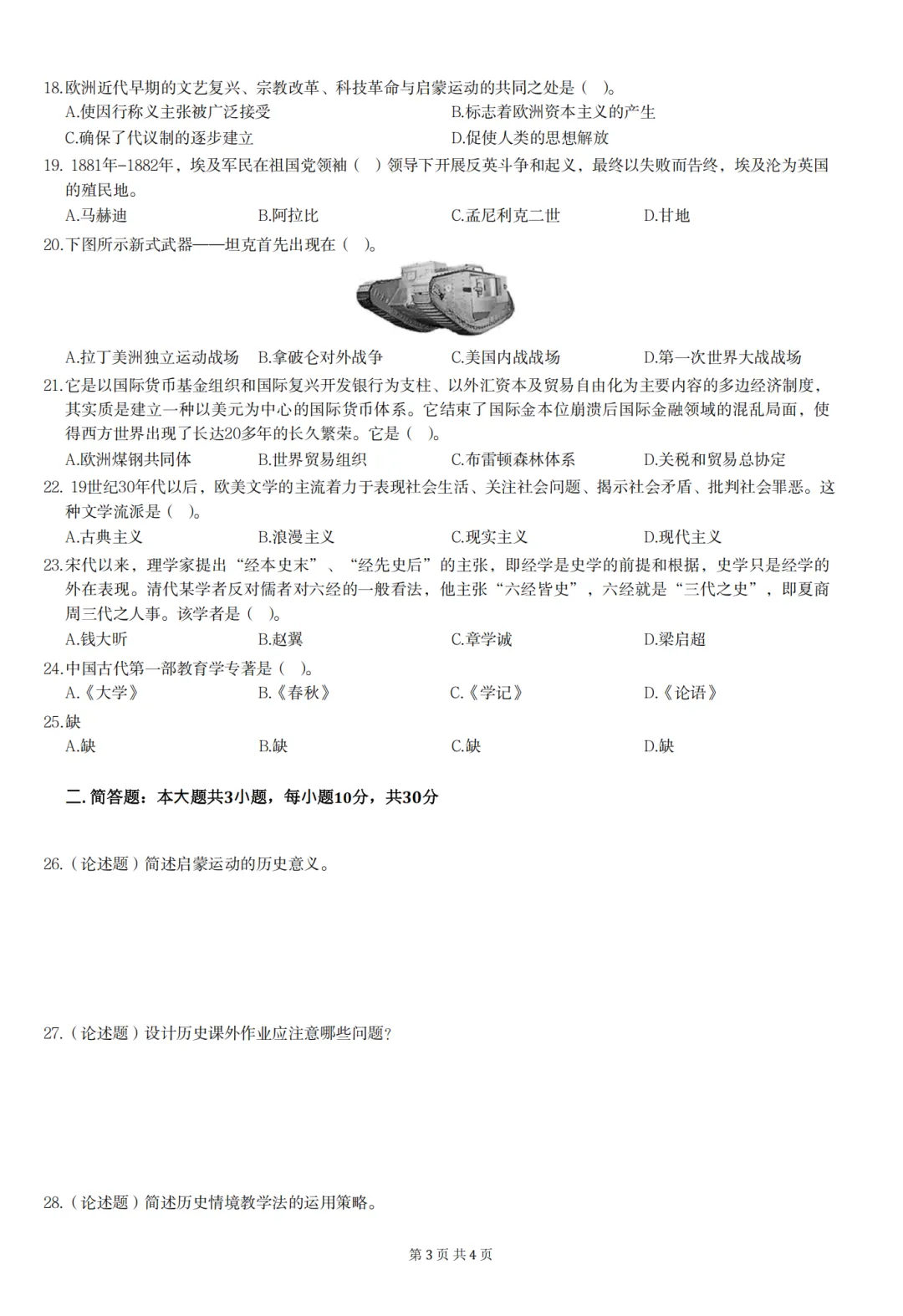 26年3月教资笔试科目三初中历史历年真题汇总含答案可打印