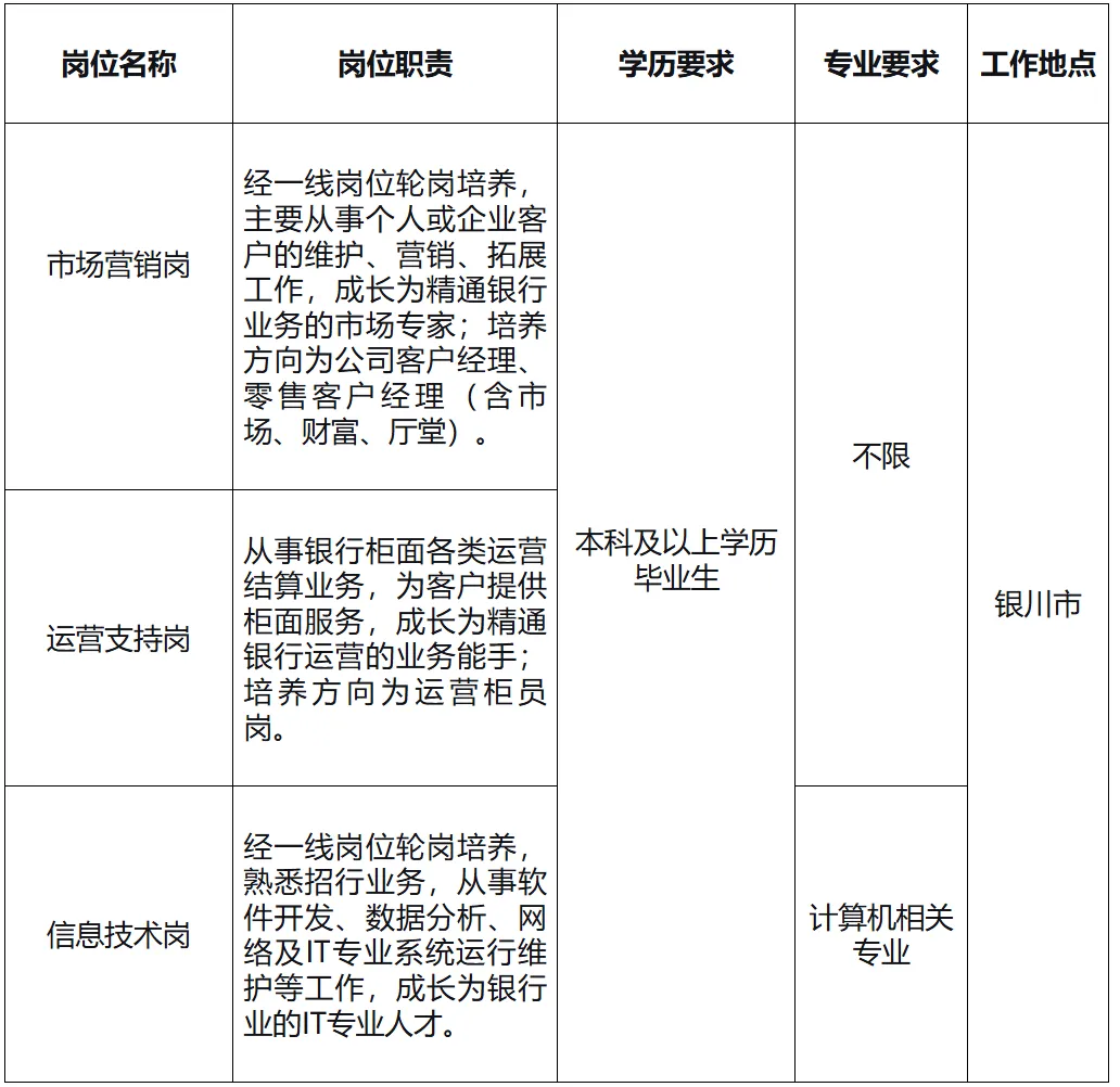 招商银行银川分行成立于2010年,是首家入驻宁夏的股份制商业银行。成立15年来,凭借优质的金融服务、持续的产品创新、严格的内部管理,连续多年被银川市人力资源和社会保障局授予“银川市社会保险诚信单位”,多次获得宁夏回族自治区发展和改革委员会等多家单位授予的“宁夏十佳企业”等荣誉。当前,分行在本地域呈现良好的发展态势,多项关键指标位居当地股份制银行前列,已建立起广泛的品牌影响力与良好的市场口碑。现根据分行业务发展,招聘2026届普通高等院校毕业生及境外院校毕业生,邀您一同梦想靠岸!