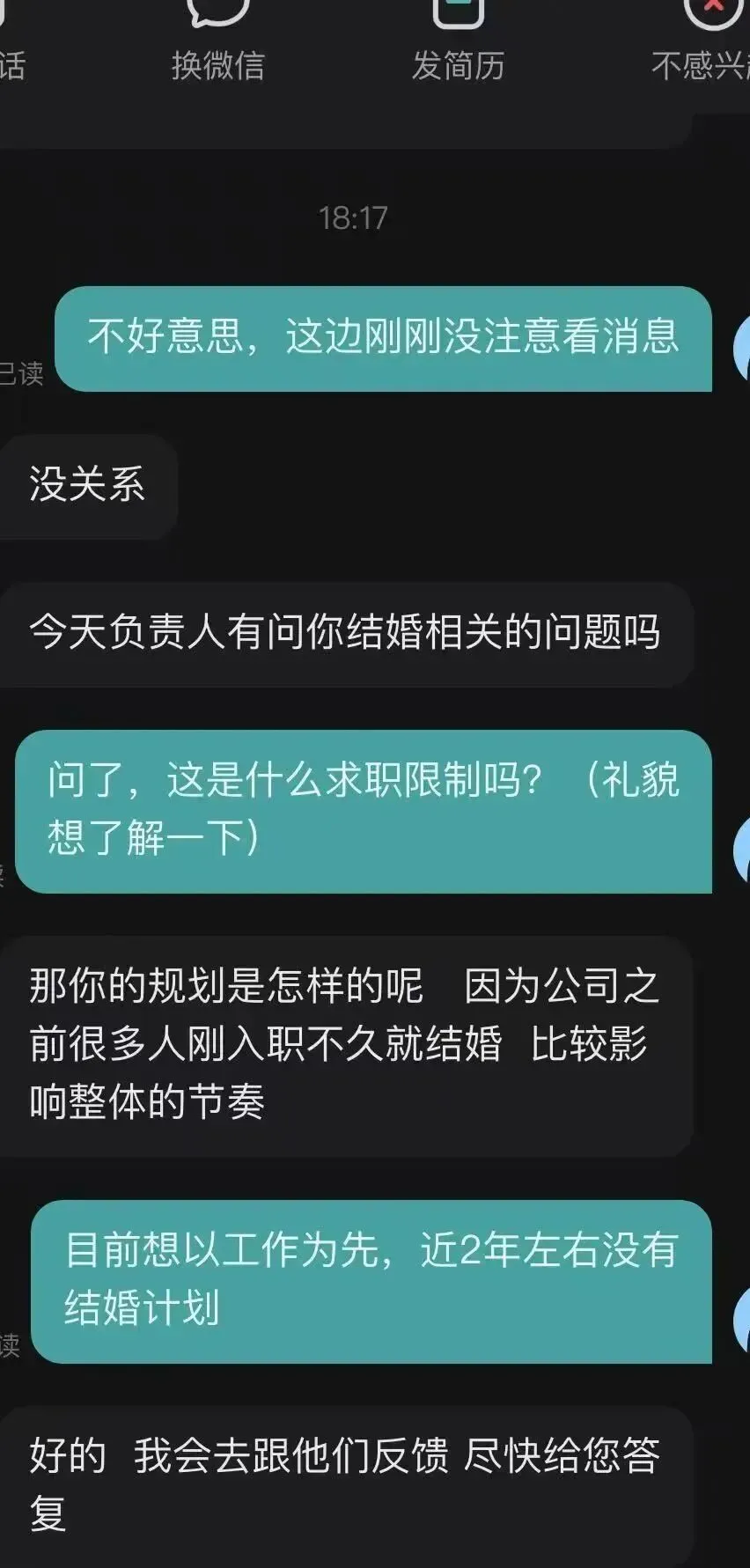 后来碰巧有机会问那个面试的HR,负责人问这些,不是故意为难我们,本质上就是在算“用人成本”,怕我们刚入职就结婚、生孩子,影响工作进度。这不公平,但真的很现实。