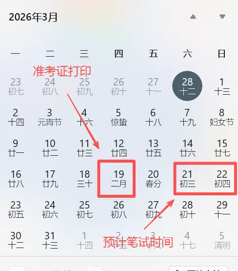 ps:准考证打印时间是3月19日,所以大概率笔试时间会在3月21日或者22日。