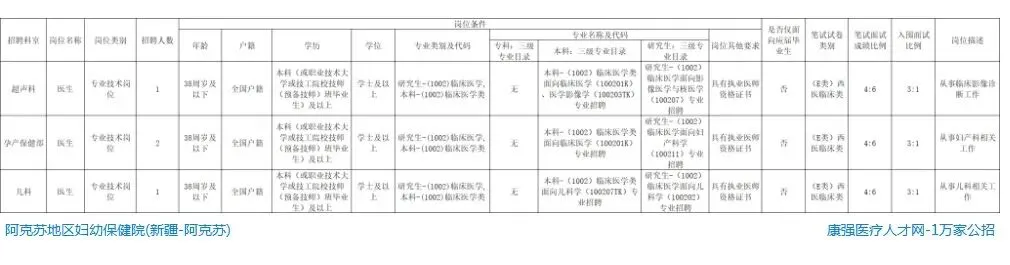 【应届生】阿克苏地区妇幼保健院招聘公告,公立三甲,本科起,招4人