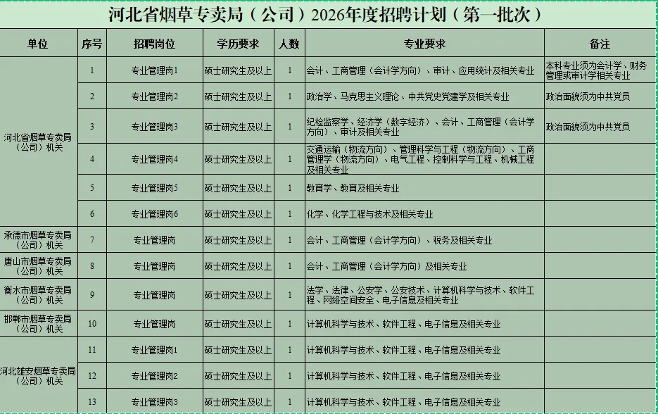 附件:1.河北省烟草专卖局(公司)2026年度招聘计划(第一批次)