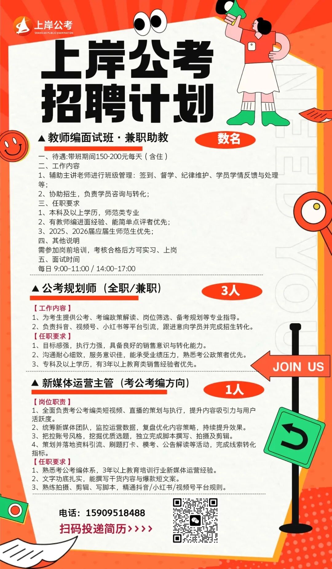 一、工作内容1、辅助主讲老师进行班级管理:签到、督学、纪律维护、学员学情反馈与处理等;2、协助招生,负责学员咨询与转化;二、任职要求1、本科及以上学历,师范类专业2、有教师编进面经验、能简单点评者优先;3、2025、2026届应届生师范生优先;三、其他说明需参加岗前培训,考核合格后方可实习、上岗四、面试时间每日 9:00–11:00 / 14:00–17:00
