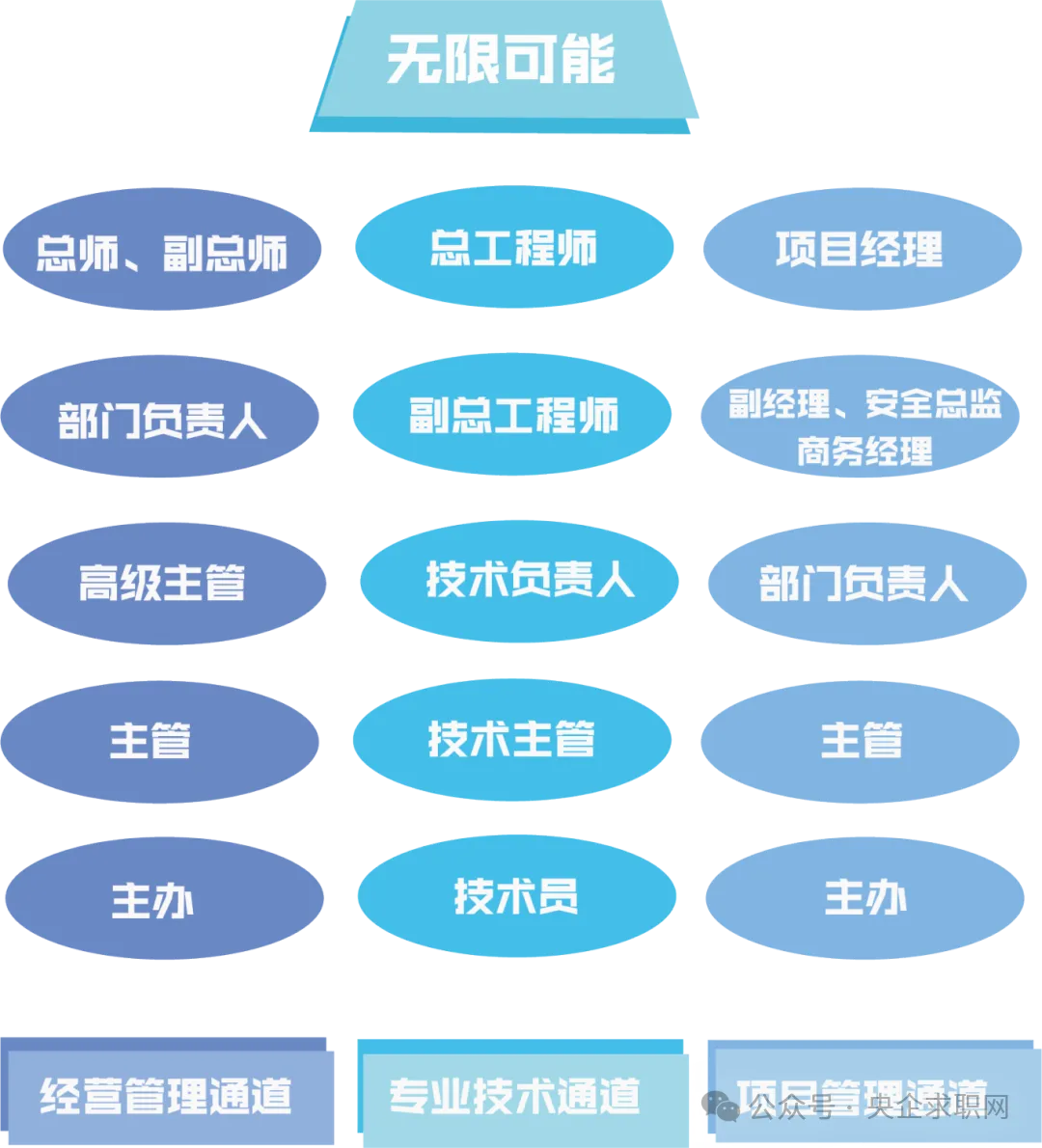 公司建立了职业发展晋升通道体系,从经营管理、专业技术、项目管理等三大晋升通道打破职业发展天花板,晋升空间更广阔更多元。