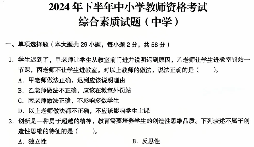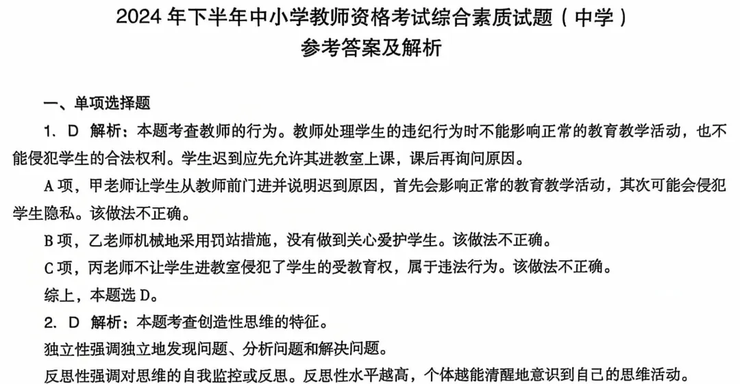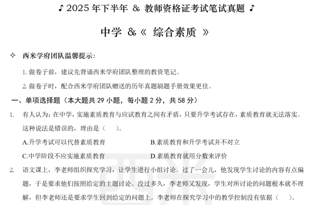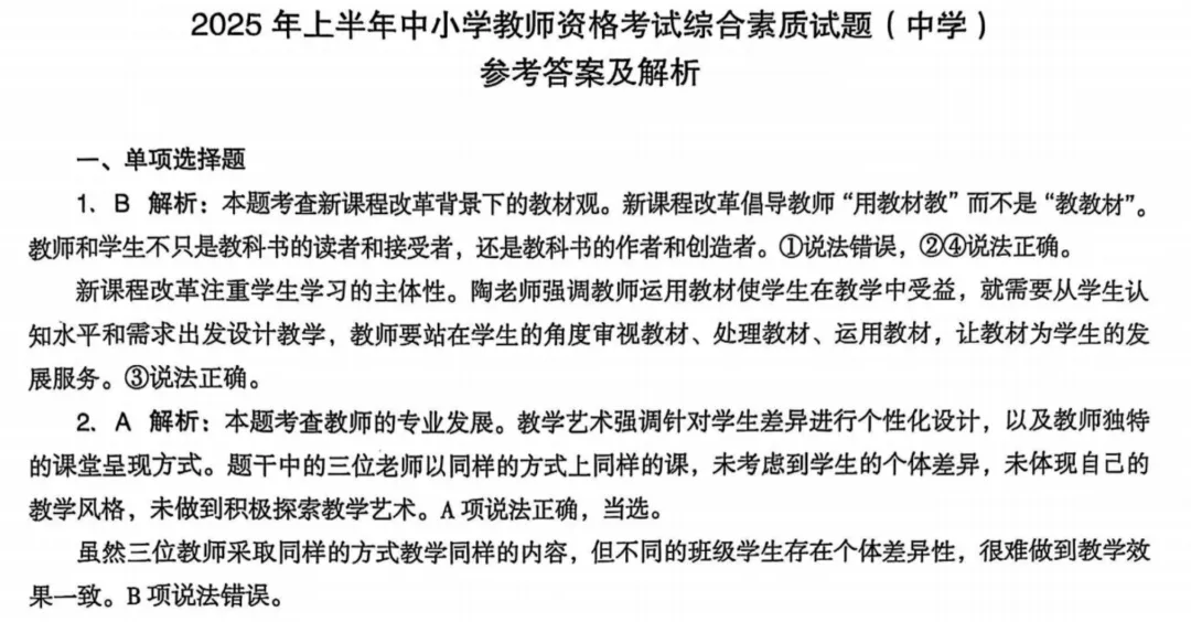 2025年下半年中小学教师资格考试(笔试)将于9月13日举行,报名时间为7月4日至7日。为帮助广大考生高效备考,小编特别整理了2011年至2025年下半年教师资格考试笔试科目一(中学)《综合素质》(代码301)历年真题及答案解析,PDF高清电子版,可直接打印,助你轻松通过教资考试!