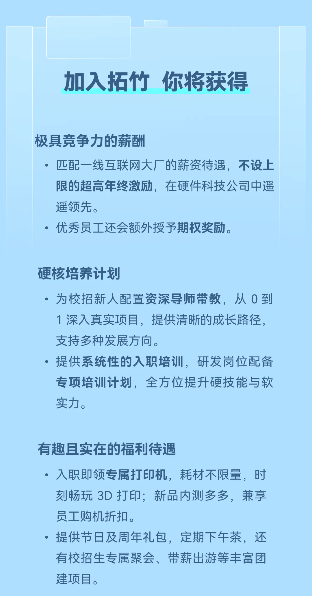 当前位置:首页>应届生招聘>春招丨应届生·校园招聘 |拓竹 26 届春招 & 27 届暑期实习同步开启,40+ 岗位方向可选