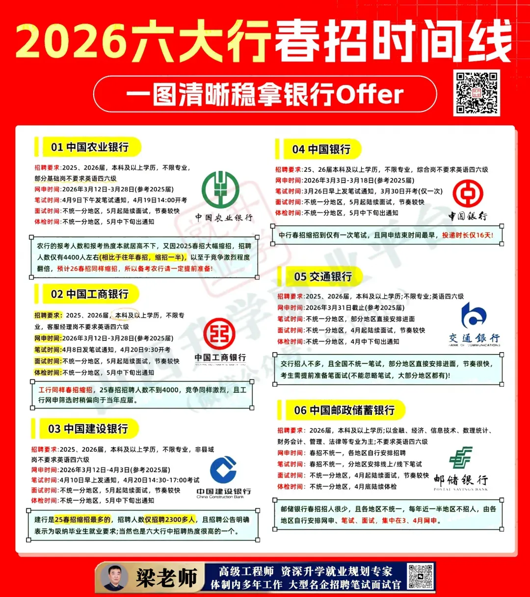 银行工作凭借稳定性强、福利完善及社会认可度高等优势,成为众多求职者的首选。其收入体系通常由“基本工资+绩效奖金+丰厚年终奖”构成,整体待遇在就业市场中颇具竞争力,且随着职级晋升,薪酬增长空间显著。职业发展路径清晰,应届生可从柜员或客户经理起步,逐步迈向管理岗位或深耕专业领域。目前,2026年银行春季招聘已全面启动,这是应届生进入银行业的“黄金窗口期”,务必紧紧抓住。相较于其他行业,银行招聘对专业限制较少,除金融经济类外,理工、文史、法学等背景学子均有大量机会。选拔模式以全国统一笔试为主,涵盖行测、英语、综合知识等,竞争虽激烈但规则公平。因此,建议广大应届生尽早启动备考计划,系统复习笔试科目,模拟面试场景,提升核心竞争力,争取在春招中脱颖而出,顺利拿到心仪的银行Offer,开启稳健的职业生涯。