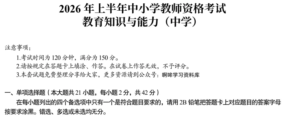 2026上教资笔试(中学)科目二《教育知识与能力》真题试卷和参考答案