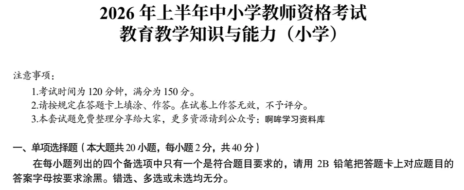 2026上教资笔试(小学)科目二《教育知识与能力》真题试卷和参考答案