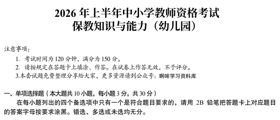 2026上教资笔试(幼儿园)科目一《综合素质》真题试卷和参考答案