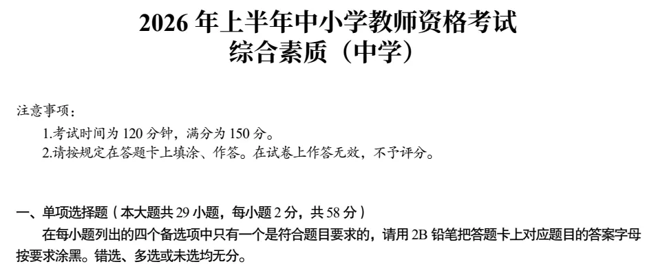 2026教师资格证<综合素质>中学 笔试真题及答案(3.6)