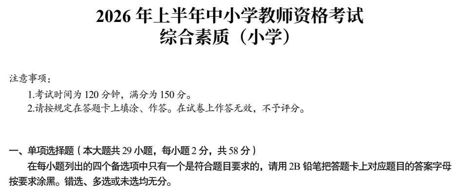2026上教资笔试(小学)科目一《综合素质》真题试卷和参考答案